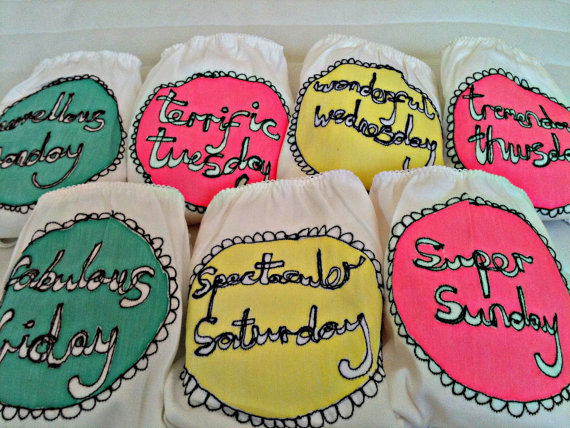 Etsy is becoming a showcase for some stunning new lingerie designers, and Alicia Rose is my latest discovery. Alicia specializes in knickers that are embroidered and then hand-painted with her original illustrations. Her day of the week knicker set is truly a work of art.