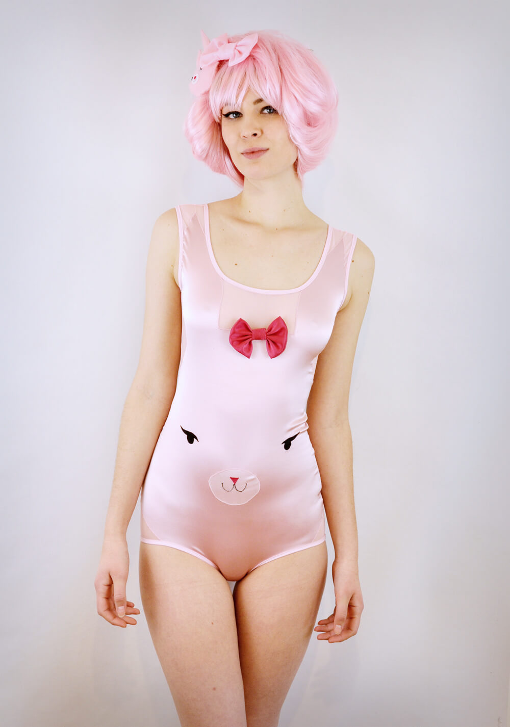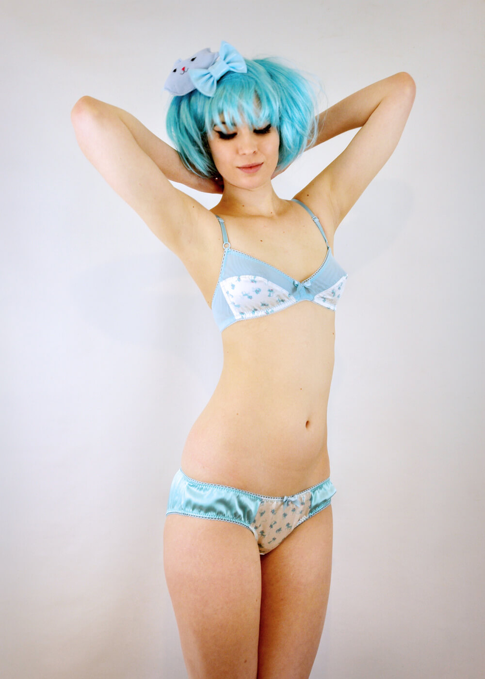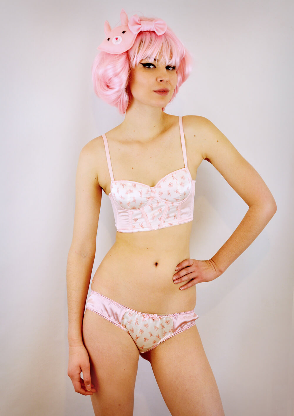 Nic originally had the idea of a line that would mimic the fun of childhood animal panties but with some grownup sass and attitude. She also wanted the line to be full of soft and luxurious materials, so the pieces are constructed from original print on a silk/cotton blend and lots of soft mesh. The new line features a longline bra, a soft cup bra, a high waist panty, a low rise panty, a matching babydoll, and a bodysuit for each set of animals.