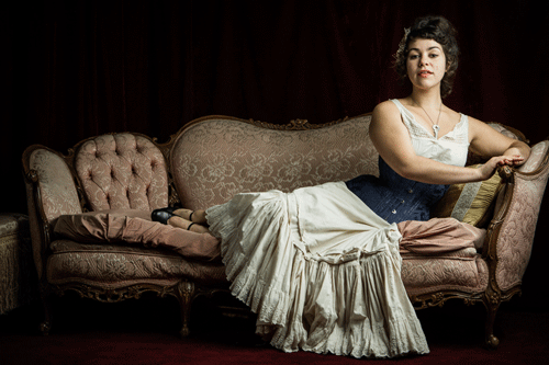 A camera lens doesn't record things as our eye sees them: notice how the model's left hand is significantly larger than the right because it is closer to the camera. Photo by Joel Aron for Dark Garden Unique Corsetry.