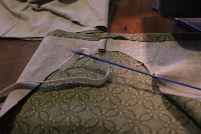 13) Pin bias tape to fabric. The bias tape only needs to be applied at the underarms, do not apply to top of bodice at neckline.