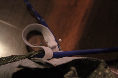 26) Once the elastic has been pulled all the way through, remove threader and pin elastic edges together.