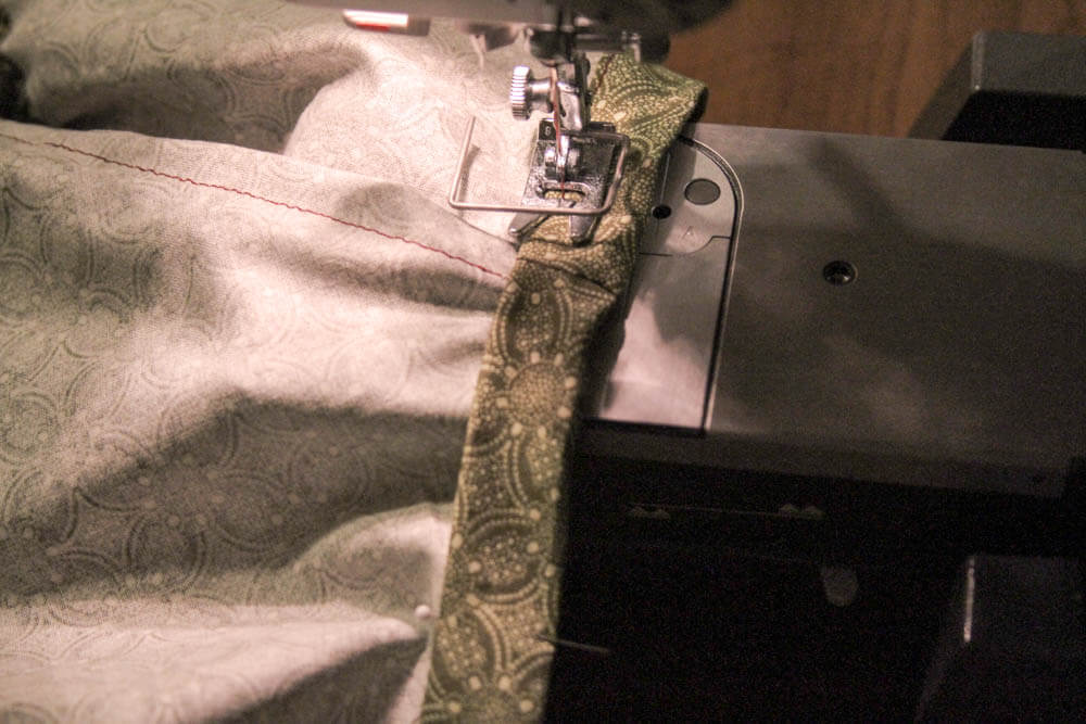 17) We now need to enclose the raw edges. Fold the bias tape once more, bringing your first fold down to your seam. Iron and pin in place.
