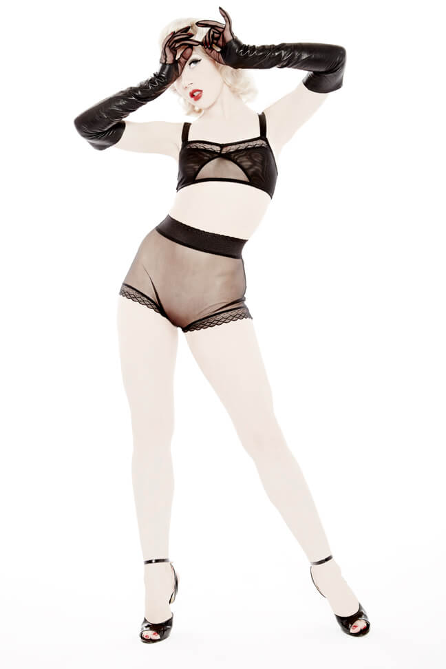 With the success of the playsuit, Stephanie and Mosh have collaborated on a full fledged collection titled Sheer Show. Named after one of Mosh's burlesque performances, these pieces are the perfect peep show, designed to accentuate, tease, and showcase the body. Using the finest period-appropriate materials and fabrics, this collection utilizes the softest mesh that clings to every curve. The main inspiration for the line came from the garments and imagery of 1930s and 40s boudoir and fetish scenes. In fact, even the most risque of items like the ouvert tap pant is based on an item from Mosh's personal vintage collection.